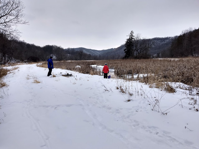 February 6th, 2022. Stop 2 on my land tour of the Whitewater Wildlife Management Area (WMA) was the Beaver Cemetery. We turned off of Hwy 74 east on to County 30. Just past 116, there is a parking area with a path. We followed the path which went over a drainage area, along a pond and then up a small hill to a field. Turns out this was not the entrance to Beaver Cemetery. We still enjoyed our walk, looking at the dried plants and walking out on the ice of the pond.